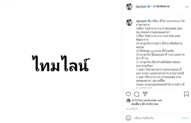 จากนั้นเพชรจ้า เปิดไทม์ไลน์ว่า 25 มีนา มีไป motorshow ไปถ่ายรายการ วันที่ 26 มีนา ไปทำงาน live ถ่ายทอดสด อุปกรณ รถยนต์ ย่านพุทธมลสาย1 วันที่ 27 มีนา ไปทำงาน live รายการรถ ยนต์ พัฒนาการ