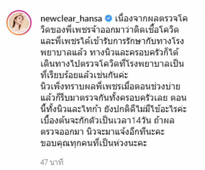 ด้านภรรยาก็ได้ออกมาโพสต์ต่อว่า เนื่องจากผลตรวจcv ของพี่เพชรจ้าออกมาว่าติดเชื้อโควิดและพี่เพชรได้เข้ารับการรักษากับทางโรงพยาบาลแล้ว ทางนิวและครอบครัวก็ได้เดินทางไปตรวจ cv ที่โรงพยาบาลเป็นที่เรียบร้อยแล้วเช่นกันค่ะ นิวเพิ่งทราบผลพี่เพชรเมื่อตอนช่วงบ่ายแล้วก็รีบมาตรวจกันทั้งครอบครัวเลย ตอนนี้ทั้งนิวและไทก้า ยังปกติดีไม่มีไข้อะไรค่ะ เบื้องต้นจะกักตัวเป็นเวลา14วัน ถ้าผลตรวจออกมา นิวจะมาแจ้งอีกทีนะคะ ขอบคุณทุกคนที่เป็นห่วงนะคะ