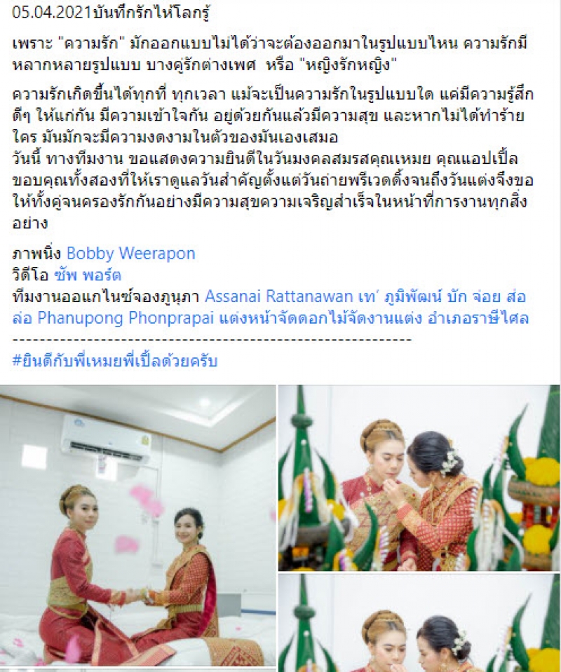 เรียกได้ว่าเป็นอีกหนึ่งภาพที่โซเชียลเข้ามาแสดงความเห็นกันเป็นจำนวนมาก หลังมีผู้ใช้เฟสบุ๊ครายหนึ่ง ได้โพสต์ภาพ ขอแสดงความยินดีในวันมงคลสมรสคุณเหมย คุณแอปเปิ้ล ขอบคุณทั้งสองที่ให้เราดูแลวันสำคัญตั้งแต่วันถ่ายพรีเวดดิ้งจนถึงวันแต่งจึงขอให้ทั้งคู่จนครองรักกันอย่างมีความสุขความเจริญสำเร็จในหน้าที่การงานทุกสิ่งอย่าง เมื่อถูฏเผยแพร่ออกไป ทำให้หลายคนเข้าใจในความรักว่า ไม่จำเป็นต้องชายรักหญิง หญิง รักหญิง ก็มีความสุขได้