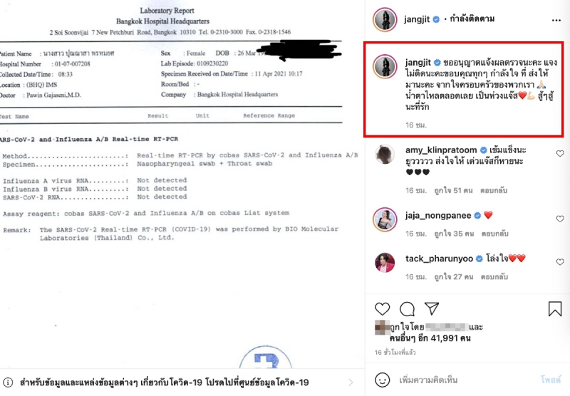 ล่าสุด แจง แจงจิต น้ำตาไหล หลังผลตรวจรอด หลังสามี แจ๊ส ชวนชื่น ติด เ ชื้ อ โ ค วิ ด- 19 โดยงานนี้ แจง ได้โพสต์ผลตรวจผ่านอินสตราเเกรมว่า