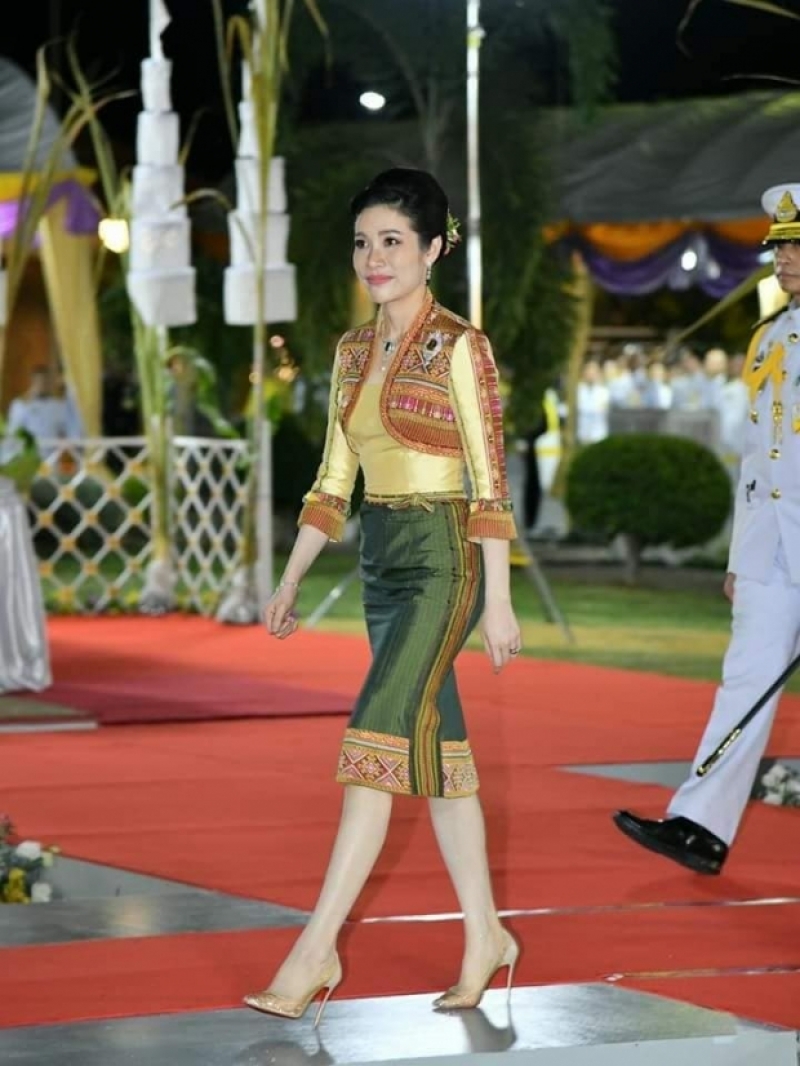 ชุดของท่านฯ ออกแบบตกแต่งอย่างประณีตงดงาม สวยสง่าอย่างลงตัว โดยแยกตัวซิ่นไว้ แต่ใช้ตีนซิ่นมาตกแต่งตัดเสื้อค่ะ (ผ้าซิ่นคนพวนศรีสัชนาลัยนั้นจะมีส่วนประกอบอยู่มีส่วนประกอบอยู่สามส่วน คือ หัวซิ่น ตัวซิ่น และตีนซิ่น ทั้งนี้เพราะสมัยโบราณนิยมทอด้วยฟืมหน้าแคบ "ตัวซิ่น" จะสั้นต้อง "ต่อหัว ต่อตีน" จึงจะนุ่งได้) เสื้อคลุมของท่าน ส่วนตรงด้านหน้า ใช้ตีนจกในการตัดแต่งเสื้อ เรียกลายตีนจก ลายสิบสองหน่วยตัด
