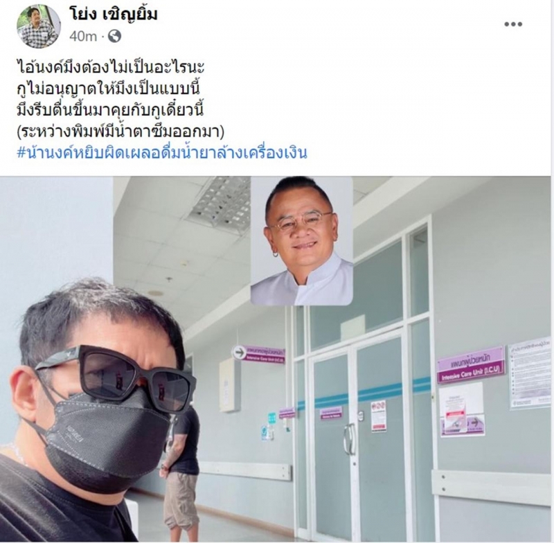 หลังจากที่ช่วงสายๆ ของวันนี้ ดาราตลกรุ่นใหญ่ โย่ง เชิญยิ้ม ได้เปิดเผยว่า น้านงค์ เชิญยิ้ม ได้เผลอหยิบน้ำย าล้างเครื่องเงินไปดื่ม จนต้องถูกนำตัวส่งโรงพยาบาลเป็นการด่วน ทำเอาหลายคนต่างตกใจ และเข้าไปให้กำลังใจกันเป็นจำนวนมาก