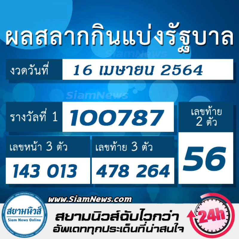 ผ่านไปแล้วสำหรับการประกาศผลสลากกินแบ่งรัฐบาล ประจำวันที่ 16 เมษายน 2564 รางวัลที่ 1 ออกหมายเลข 100787 ส่วนรางวัล เลขหน้า 3 ตัว ออกหมายเลข143 และ 013 รางวัลเลขท้าย 3 ตัว ออกหมายเลข 264 และ 478 ขณะที่รางวัลเลขท้าย 2 ตัว ออกหมายเลข 56
