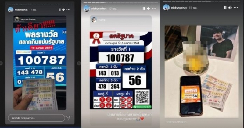 ขณะที่หนุ่มนิกกี้ยังโพสต์สตอรี่ในไอจีเป็นภาพสลากกินแบ่งรัฐบาลที่มีคนซื้อตามเลขก้อย-นิกกี้ ใบหนึ่งถูกเลขหน้า 3 ตัว 143 ส่วนอีกใบ เลขตรงรางวัลที่ 1 ผิดตัวแรกไปตัวเดียว ไม่งั้นมีเฮหนักกว่านี้แน่