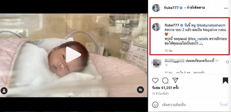 โดย ฟลุค เกริกพล ได้โพสต์ระบุข้อความว่า วันนี้หนู @babynatashacm #ตรวจ รอบ 2 เเล้ว ผลเป็น Negative naka พรุ่งนี้ รอคุณเเม่ @lee_natalie ตรวจอีกรอบ ขอให้คุณเเม่ไม่เป็นอะไร นั่นเอง