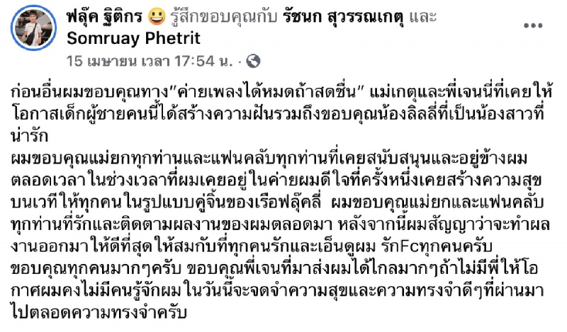 จากกรณี ฟลุ๊ค ฐิติกร ได้ออกมาโพสต์ข้อความชี้แจงเอาไว้ว่า ก่อนอื่นผมขอบคุณทาง ค่ายเพลงได้หมดถ้าสดชื่น แม่เกตุและพี่เจนนี่ที่เคยให้โอกาสเด็กผู้ชายคนนี้ได้สร้างความฝันรวมถึงขอบคุณน้องลิลลี่ที่เป็นน้องสาวที่น่ารัก