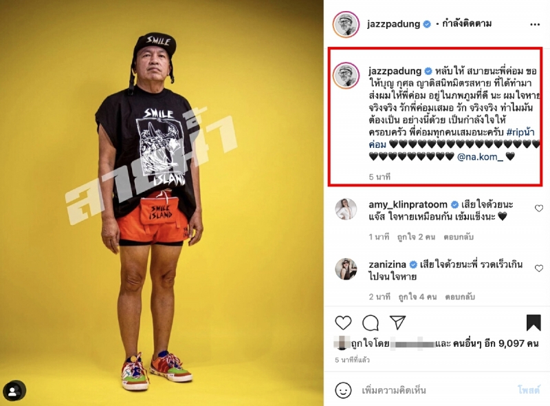 เเละล่าสุด แจ๊ส ชวนชื่น นั้นก็ยากเกินทำใจ โพสต์บอกลา น้าค่อม ครั้งสุดท้าย หลังเสียชีวิตกะทันหัน โดย เเจ๊ส ได้โพสต์ระบุข้อความว่า