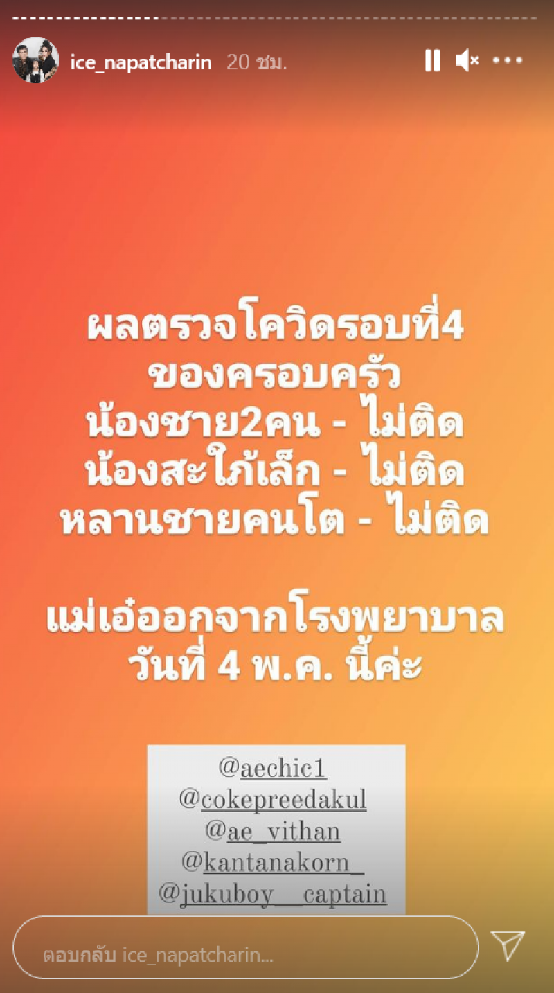 ล่าสุดหลังจากผ่านเรื่องราวทีถือว่าเลวร้ายที่สุดไปแล้ว ไอซ์ ก็ได้ออกมาประกาศข่าวดีว่า น้องชายทั้ง 2 คนที่กักตัวรวมไปถึงน้องสะใภ้และหลานชายนั้นไม่มีใครที่ ติ ด เ ชื้ อ โ ค วิ ด - 1 9 เพิ่มเติมแล้ว