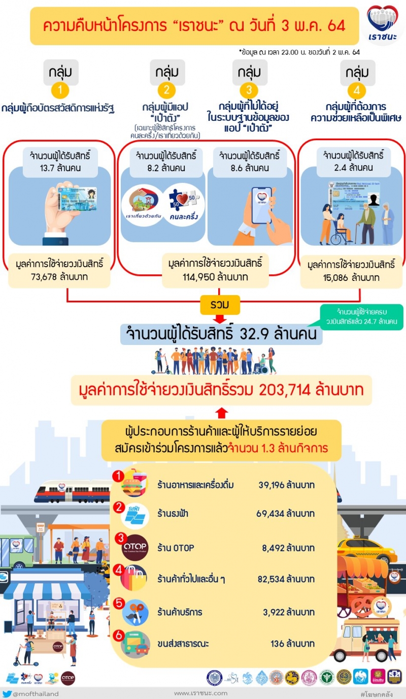 กระทรวงการคลัง รายงาน ความคืบหน้าของโครงการ เราชนะ ณ วันที่ 3 พฤษภาคม 2564 ได้รับสิทธิ 32.9 ล้านคน มูลค่าใช้จ่ายวงเงินรวม 203,714 ล้านบาท ดังนี้