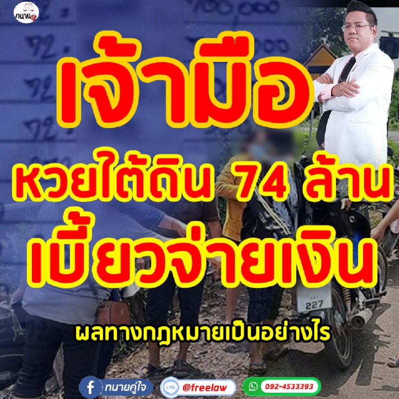 7 พ.ค.64 ทนายรณณรงค์ แก้วเพ็ชร์ ประธานเครือข่ายรณรงค์ทวงคืนความยุติธรรมในสังคม ได้ออกมาโพสต์เคลื่อนไหวผ่านเพจ ทนายคู่ใจ กรณีเจ้ามือ ห ว ย ใ ต้ ดิ น เบี้ยวรางวัล 74 ล้านบาท ผลทางกฎหมายเป็นอย่างไร เป็นข่าวฮือฮาในโลกออนไลน์ เมื่อชาวบ้านจังหวัดแพร่ถูกรางวัลหวยใต้ดินเลข272กันเกือบทั้งหมู่บ้าน รวมๆกัน 74 ล้านบาท แต่ปรากฏว่าเจ้ามือหวยใต้ดินนั้นบอกว่าจะขอจ่ายแค่ครึ่งเดียว
