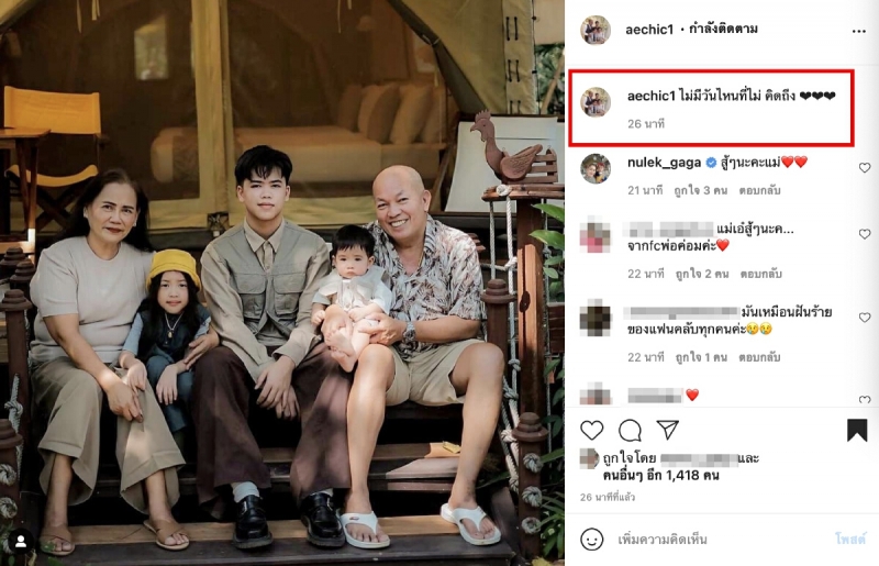 ซึ่งหลังจากนั้นทางด้าน แม่เอ๋ หรือ เมียน้าค่อม นั้นก็ได้เคลื่อนไหวแล้วผ่านอินสตราเเกรม หลังลูกสาว ไอซ์ ณพัชรินท์ โดน ด่ า อย่าพากันผลาญเงินพ่อ ซึ่ง แม่เอ๋ ไม่ได้ตอบโต้โดยการด่ากลับหรืออย่างไร เเต่กลับโพสต์ภาพรูปน้าค่อม พร้อมหน้าพร้อมตาครอบครัว เเละระบุข้อความเพียงสั้นๆว่า "ไม่มีวันไหนที่ไม่ คิดถึง" ท่ามกลางกำลังใจของแฟนคลับที่ส่งมาให้ครอบครัวสู้ต่อไปอย่างล้นหลาม