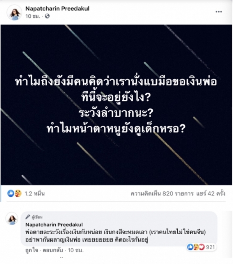 โดยสาวไอซ์ได้โพสต์ข้อความผ่านเฟซบุ๊คส่วนตัวระบุข้อความว่า ทำไมถึงยังมีคนคิดว่าเรานั่งแบมือขอเงินพ่อ ทีนี้จะอยู่ยังไง? ระวังลำบากนะ? ทำไมหน้าตาหนูยังดูเด็กหรอ? พ่อไม่อยู่ละระวังเรื่องเงินกันหน่อย เงินกงสีจะหมดเอา (เราคนไทยไม่ใช่คนจีน) อย่าพากันผลาญเงินพ่อ เหยยยยยยย คิดอะไรกันอยู่