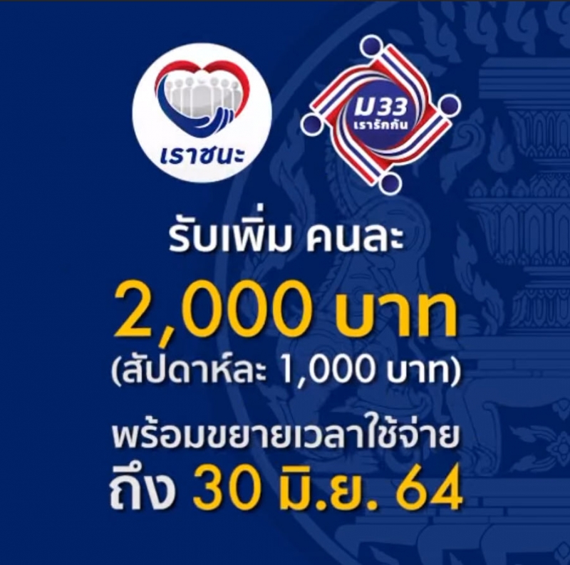จากกรณี คณะรัฐมนตรี(ครม.) เมื่อวันที่ 11 พฤษภาคม 2564 ได้มีมติเห็นชอบให้สนับสนุนวงเงินสิทธิ์เพิ่มเติมโครงการเราชนะ และม.33 เรารักกัน โดยเพิ่มเงินคนละ 2,000 บาท แบ่งเป็น ผู้เข้าร่วมโครงการเราชนะ จำนวน 32.9 ล้านคน และโครงการ ม33 เรารักกัน จำนวน 9.27 ล้านคน ใช้งบประมาณกว่า 85,500 ล้านบาท
