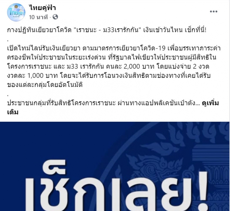 ล่าสุด ทางด้านเพจเฟสบุ๊ก ไทยคู่ฟ้า ก็ได้เผยรายละเอียดเกี่ยวกับ เราชนะ - ม33เรารักกัน เงินเข้าวันไหน เช็กเลย โดยระบุว่า...