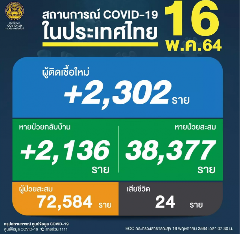 กระทรวงสาธารณสุข ได้รายงานสถานการณ์ โ ค วิ ด-19 ประจำวันเบื้องต้น โดยข้อมูล ณ วันที่ 16 พ.ค. 2564 มีผู้ ป่ ว ย ผู้ติ ด เ ชื้ อ รายใหม่เพิ่มสูงขึ้นอีก 2,302 คน ส่งผลทำให้ยอด ป่ ว ย สะสมอยู่ที่ 101,447 ราย ผู้ เ สี ย 24 รวมยอดสะสม 589 ราย