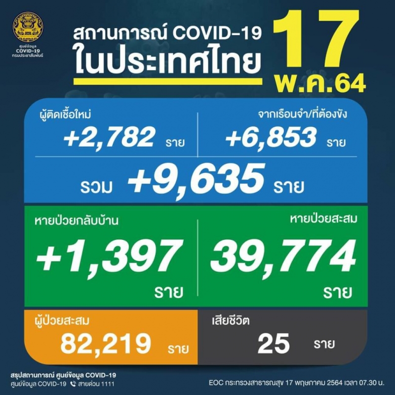วันนี้ (17 พ.ค.2564) ศบค.รายงานสถานการณ์การ ระลอก 3 ประจำวันเบื้องต้นว่า วันนี้พบผู้ ป่ ว ย รายใหม่รวม 9,635 ราย จำแนกเป็น ผู้ติด เ ชื้ อ ใหม่ 2,782 ราย, ติ ด เ ชื้ อ ในเรือนจำที่ต้องขัง 6,853 ราย