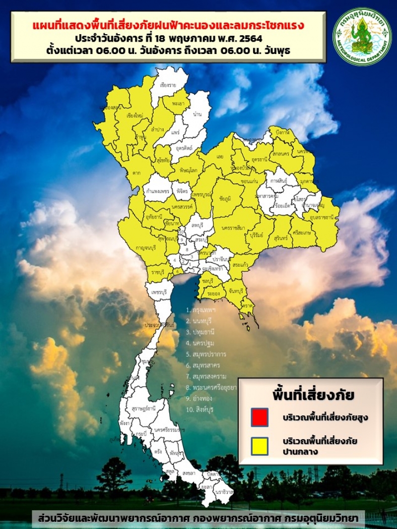 กรมอุตุนิยมวิทยา รายงานแผนที่แสดงพื้นที่เสี่ยงภัยฝนฟ้าคะนอง และลมกระโชกแรง ประจำวันที่ 18 พฤษภาคม 2564 ตั้งแต่เวลา 06.00 น. ถึงเวลา 06.00 น. วันที่ 19 พฤษภาคม 2564 โดยจังหวัดที่เป็นพื้นที่เสี่ยง ได้แก่ แม่ฮ่องสอน, เชียงใหม่, พะเยา, ลำปาง, ลำพูน, ตาก, สุโขทัย, นครสวรรค์, เพชรบูรณ์, พิษณุโลก, เลย, ชัยภูมิ, ขอนแก่น, หนองบัวลำภู, อุดรธานี, สกลนคร, บึงกาฬ, นครพนม, มุกดาหาร, อุบลราชธานี, ศรีสะเกษ, สุรินทร์, บุรีรัมย์, นครราชสีมา, นครนายก, สระแก้ว, ชลบุรี, ระยอง, จันทบุรี, ตราด, อุทัยธานี, ชัยนาท, สุพรรณบุรี, กาญจนบุรี, ราชบุรี, สมุทรสงคราม และสมุทรสาคร