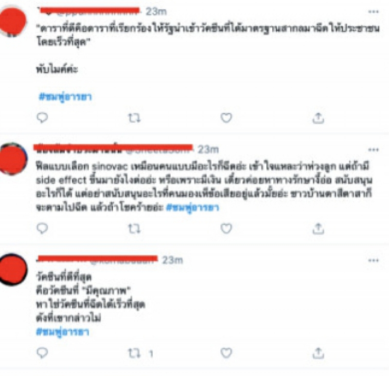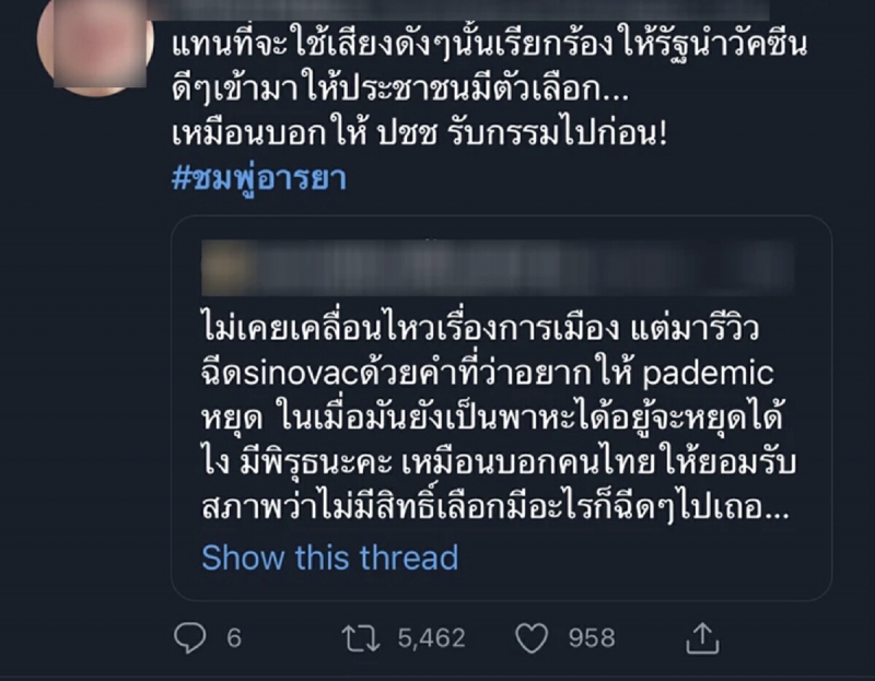 ล่าสุดต้องบอกว่าทำเอาซุปตาร์ตัวเเม่อย่าง สาวชมพู่ นั้นงานเข้าเต็มๆเจอทัวร์ลงยับ โดนถล่ม จนติดเทรนด์ทวิตเตอร์อันดับ 1 ซึ่ง สาวชมพู่ นั้นก็ได้ถูกชาวโลกออนไลน์วิพากษ์วิจารณ์อย่างหนัก ว่า การที่เข้ารับการ ฉี ด วั ค ซี นนั้น ส่วนตัวไม่เคยเคลื่อนไหวในเรื่องการเมือง เเต่กลับมา รี วิ ว ฉี ด วั ค ซี น sinovacเป็นเพราะการ Pr หรือไม่