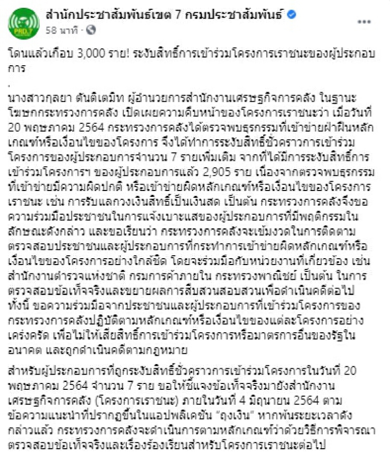 จึงได้ทำการระงับสิทธิ์ชั่วคราวการเข้าร่วมโครงการของผู้ประกอบการจำนวน 7 รายเพิ่มเติม จากที่ได้มีการระงับสิทธิ์การเข้าร่วมโครงการฯ ของผู้ประกอบการแล้ว 2,905 ราย เนื่องจากตรวจพบธุรกรรมที่เข้าข่ายมีความผิดปกติ หรือเข้าข่ายผิดหลักเกณฑ์หรือเงื่อนไขของโครงการเราชนะ เช่น การรับแลกวงเงินสิทธิ์เป็นเงินสด เป็นต้น กระทรวงการคลังจึงขอความร่วมมือประชาชนในการแจ้งเบาะแสของผู้ประกอบการที่มีพฤติกรรมในลักษณะดังกล่าว