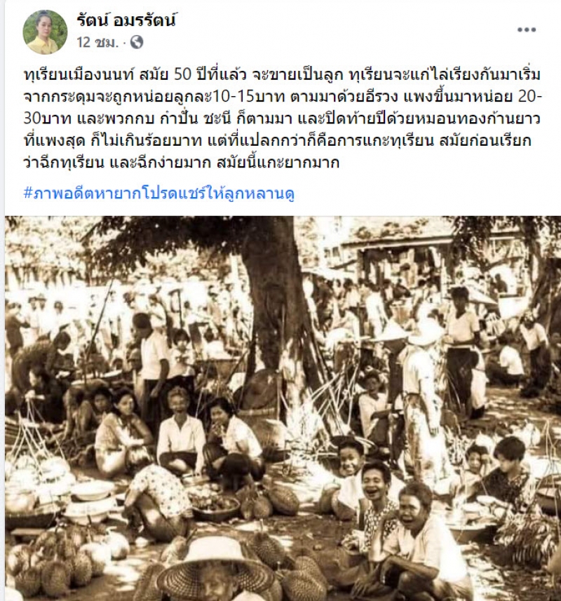 เรียกได้ว่าเป้นอีกหนึ่งภาพ ที่โซเชียลเข้ามาแสดงความ้เห็นเยอะมากๆ หลังมีผู้ใช้เฟสบุ๊ครายหนึ่งได้ออกมาโพสต์ภาพพร้อมทั้งระบุข้อความว่า ทุเรียนเมืองนนท์ สมัย 50 ปีที่แล้ว จะขายเป็นลูก ทุเรียนจะแก่ไล่เรียงกันมาเริ่มจากกระดุมจะถูกหน่อยลูกละ10-15บาท ตามมาด้วยอีรวง แพงขึ้นมาหน่อย 20-30บาท และพวกกบ กำปั่น ชะนี ก็ตามมา และปิดท้ายปีด้วยหมอนทองก้านยาว ที่แพงสุด ก็ไม่เกินร้อยบาท แต่ที่แปลกกว่าก็คือการแกะทุเรียน สมัยก่อนเรียกว่าฉีกทุเรียน และฉีกง่ายมาก สมัยนี้แกะยากมาก #ภาพอดีตหายากโปรดแชร์ให้ลูกหลานดู