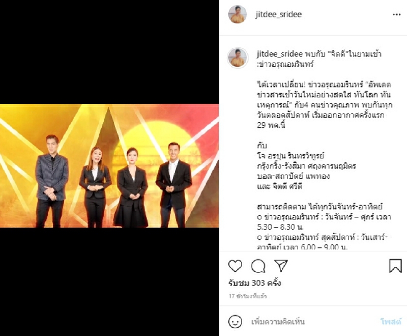 ล่าสุดทางด้าน จิตดี ศรีดี ก็ได้ออกมาโพสต์ข้อความเอาไว้ว่า พบกับ จิตดี ในยามเช้า ข่าวอรุณอมรินทร์ ได้เวลาเปลี่ยน! ข่าวอรุณอมรินทร์ อัพเดตข่าวสารเช้าวันใหม่อย่างสดใส ทันโลก ทันเหตุการณ์ กับ4 คนข่าวคุณภาพ พบกันทุกวันตลอดสัปดาห์ เริ่มออกอากาศครั้งแรก 29 พค.นี้ กับ โจ อรชุน รินทรวิฑูรย์ กรุ๊งกริ๊ง-รังสิมา ศฤงคารนฤมิตร บอล-สถาปัตย์ แพทองและ จิตดี ศรีดี