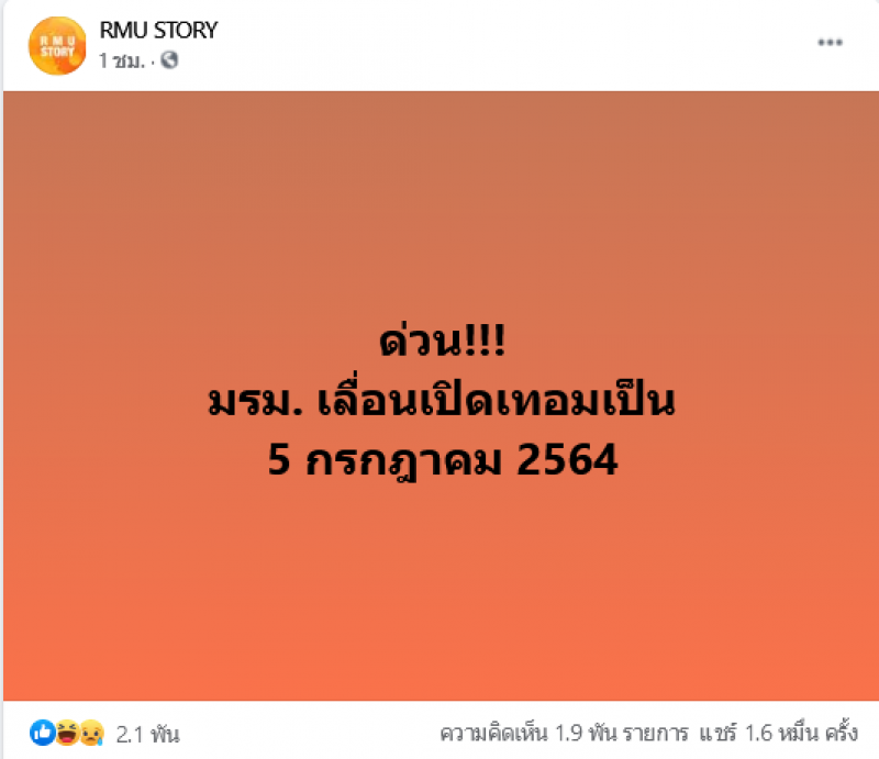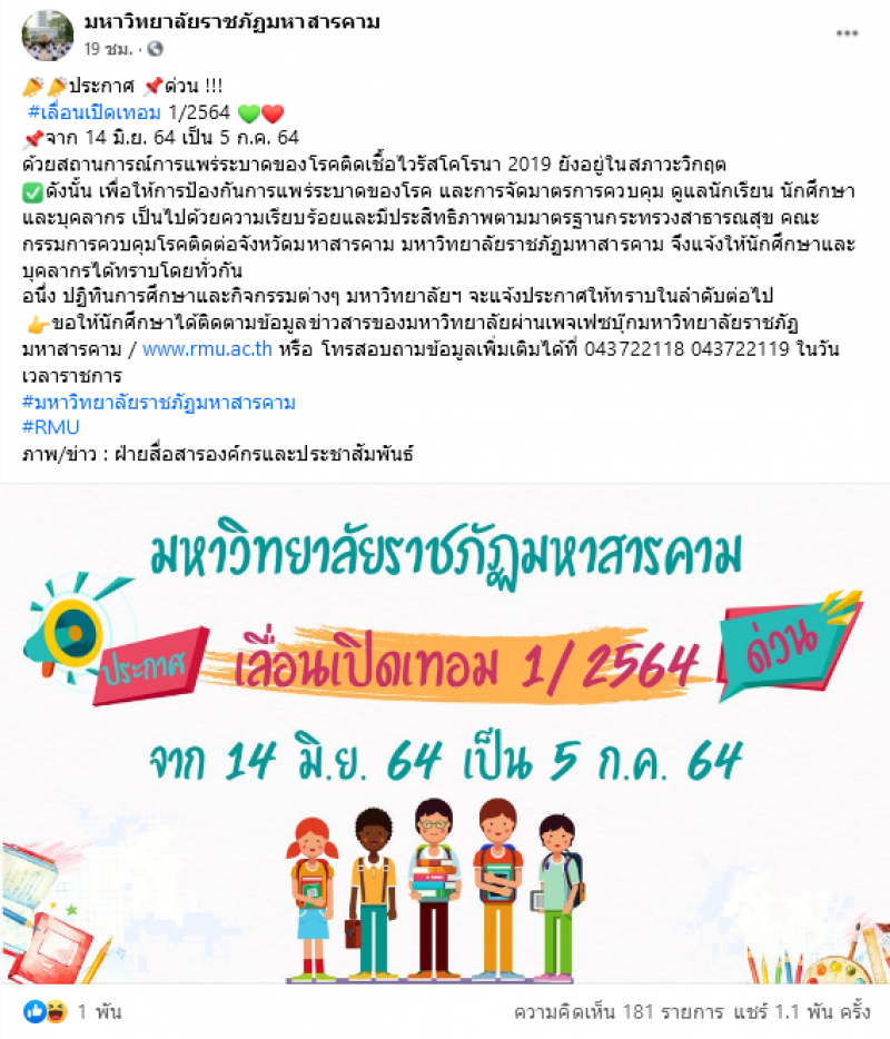 ล่าสุดทางเพจมหาวิทยาลัยราชภัฏมหาสารคาม ได้โพสต์ประกาศเลื่อนเปิดเทอมโดยได้ระบุข้อความว่า ด่วน มรม.เลื่อนเปิดเทอมเป็น 5 กรกฎาคม 2564