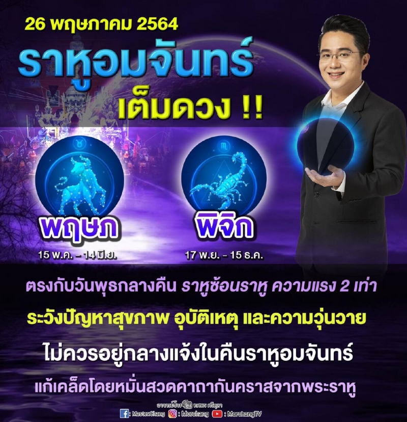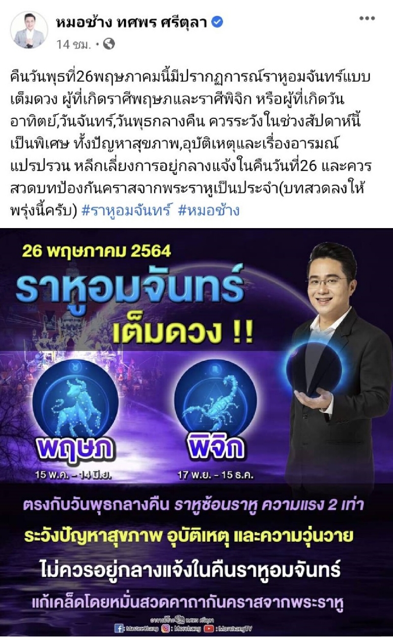 เมื่อวันที่ 24 พ.ค. 64 หมอช้าง ทศพร ศรีตุลา หมอดูชื่อดังได้โพสต์เฟซบุ๊กผ่านเพจ "หมอช้าง ทศพร ศรีตุลา" แจ้งเตือนผู้ที่เกิด 2 ราศี และ 3 วันเกิด ที่ต้องระวังปัญหาสุขภาพ อุ บั ติ เ ห ตุ และความวุ่นวาย โดยวันที่ 26 พฤษภาคม 2564 จะเกิดปรากฎการณ์ราหูอมจันทร์เต็มดวง ซึ่งตรงกับวันพุธกลางคืน ราหูซ้อนราหู ความแรง 2 เท่า