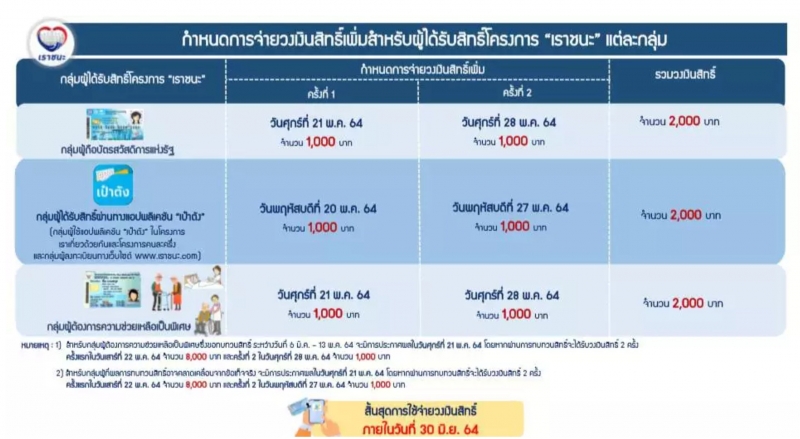 ความคืบหน้ามาตรการ เ ยี ย ว ย า โ ค วิ ด เราชนะ ซึ่งคณะรัฐมนตรีมีมติเพิ่มวงเงินช่วยเหลือ เพิ่มอีก 2,000 บาท จาก 7,000 บาท รวมเป็น 9,000 บาท โดยแบ่งโอนวงเงินเป็น 2 ง ว ด งวดแรก 1,000 บาท เข้าแล้วเมื่อ 20-21 พ.ค. ส่วนกลุ่มเพิ่งผ่านการตรวจสอบสิทธิเราชนะ ผ่านการคัดกรองการทบทวนสิทธิ ได้รับเงินงวดแรก 8,000 บาท เข้าแอปฯ เป๋าตัง และบัตรประชาชน ไปเรียบร้อยเช่นกัน เมื่อ 22 พ.ค.64 ที่ผ่านมานั้น