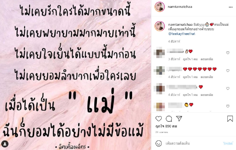 ทั้งนี้เมื่อย้อนดูในไอจีของน้องน้ำตาลเมื่อ 4 สัปดาห์ที่แล้วจะเห็นว่าเธอโพสต์ภาพข้อความถึงความเป็นแม่ที่บอกได้คำเดียวว่าสตรองมากโดยโพสต์ดังกล่าวระบุว่า.. .ไม่เคยรักใครมากขนาดนี้ ไม่เคยพบพยายามมาก มายขนาดเท่านี้ ไม่เคยใจเย็นได้แบบนี้มาก่อน ไม่เคยยอมลำบากเพื่อใครเลย เมื่อได้เป็นแม่ ฉันก็ยอมได้อย่างไม่มีข้อแม้ พร้อมกับแคปชั่นประกอบว่า "Babyyyคนเป็นแม่เพื่อลูกยอมได้ทุกอย่างค้าบบบบ" ขอยกนิ้วให้กับความสตรองของน้องน้ำตาลเลยจ้า
