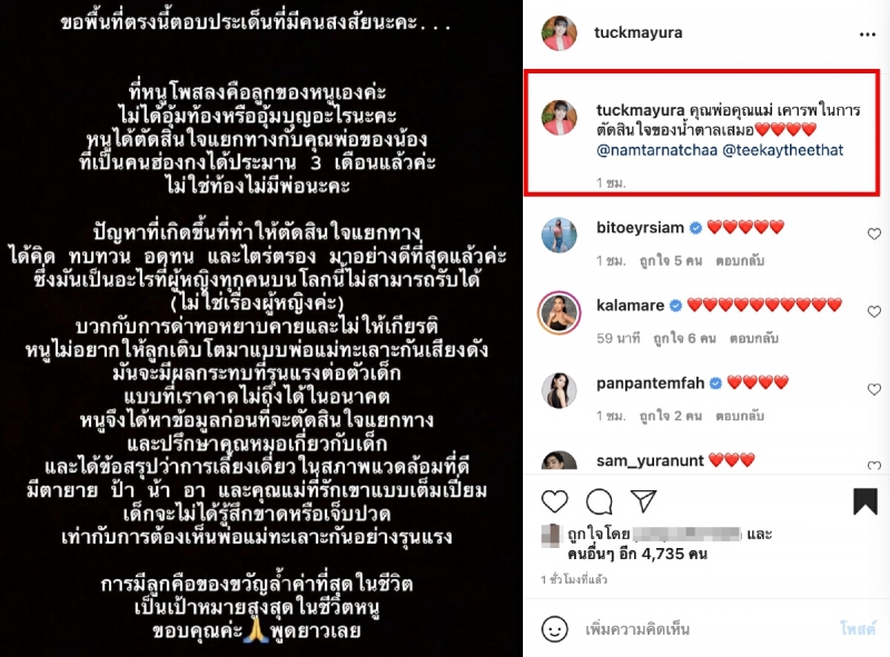 ทางด้านคุณแม่ ตั๊ก มยุรา ก็ได้โพสต์เฟซบุ๊คเช่นกัน หลังลูกสาว น้ำตาล ณัชชา แยกทางสามี ยอมเป็นคุณแม่เลี้ยงเดี่ยว ซึ่งงานนี้ ตั๊ก มยุรา ก็ได้โพสต์ให้กำลังใจลูกสาวของตนเองว่า คุณพ่อคุณแม่ เคารพในการตัดสินใจของน้ำตาลเสมอ