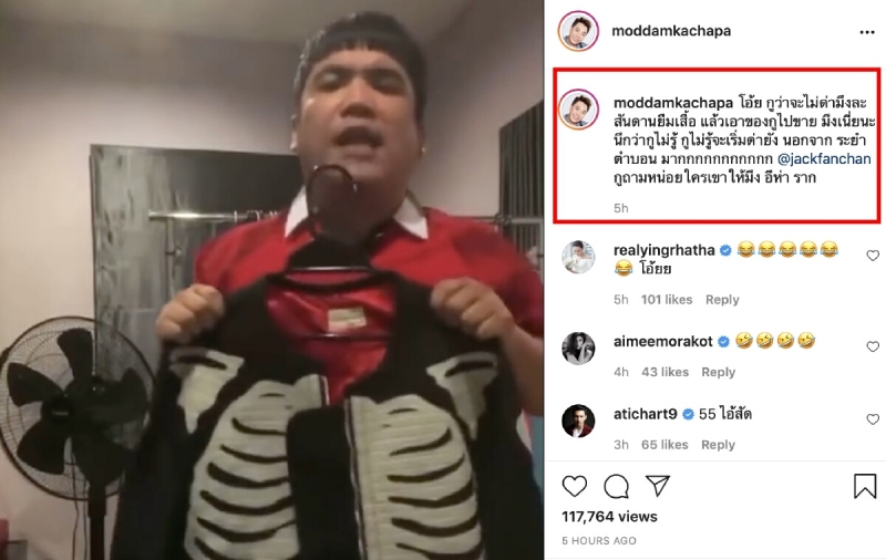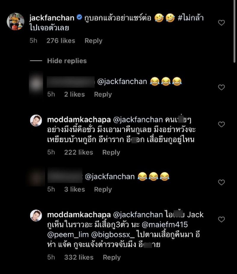 โดยทางด้าน มดดำ คชาภา ได้ออกมาโพสต์พร้อมกับระบุข้อความเอาไว้ว่า โอ้ย ว่าจะไม่ ด่ า มึ งละ สั น ด า...ยืมเสื้อ แล้วเอาของ ตรู ไปขาย มึ งเนี่ยนะ นึกว่าไม่รู้ ไม่รู้จะเริ่มด่ ายัง นอกจาก ระ ยำ ตำ บอน มากกกกกกกกกกก @jackfanchan