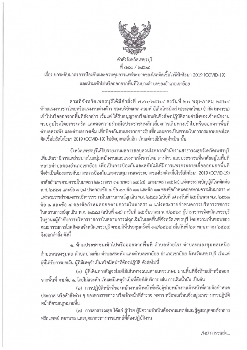 ใจความระบุว่า ห้ามประชาชนเข้าไปหรือออกจากพื้นที่ ตำบลห้วยโรง ตำบลหนองชุมพลเหนือ ตำบลหนองชุมพล ตำบลบางค็ม ตำบลสระพัง และตำบลเขาย้อย อำเภอเขาย้อย จังหวัดเพชรบุรี เว้นแต่ ผู้ที่ได้รับการยกเว้น ผู้ที่มีเหตุจำเป็นหรือมีหน้าที่ต้องปฏิบัติ