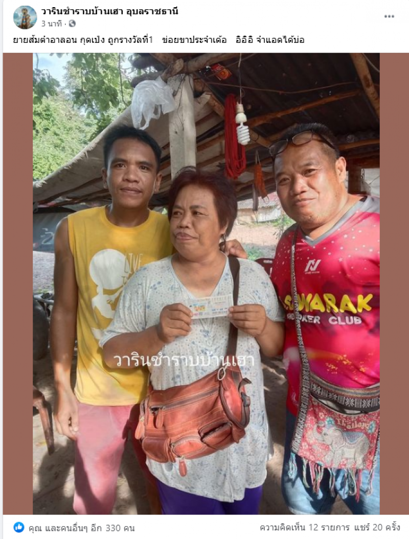 ล่าสุดพบคนถูกรางวัลที่ 1 โดยเพจ วารินชำราบบ้านเฮา อุบลราชธานี ได้ออกมาโพสต์ภาพพร้อมทั้งระบุข้อความว่า ยายส้มตำอาลอน กุดเป่ง ถูกรางวัลที่1 ข่อยขาประจำเด้อ อิอิอิ จำแอดได้บ่อ
