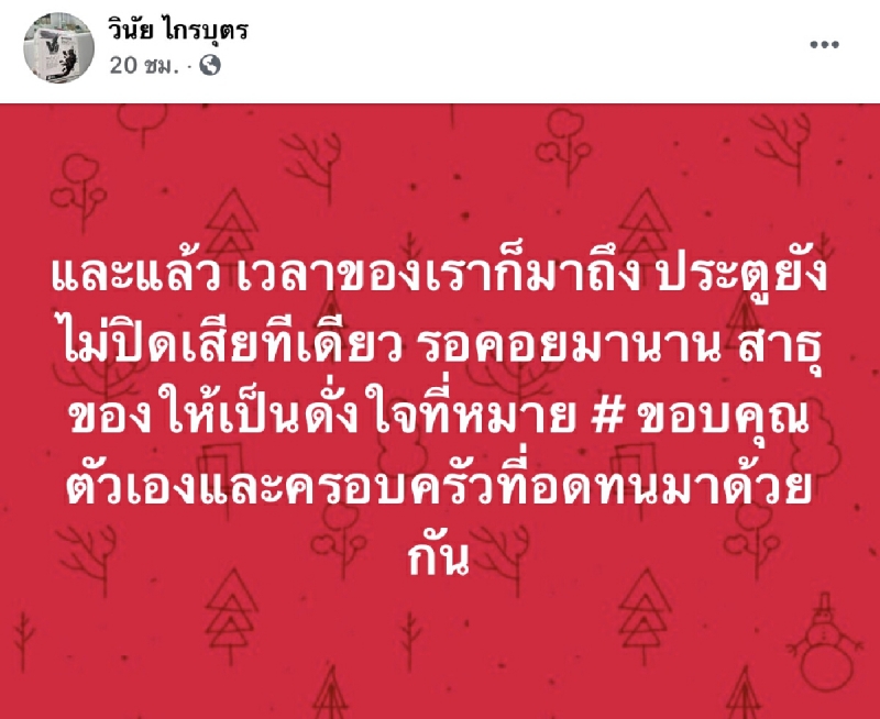 ล่าสุดทางด้าน เมฆ วินัย ได้ออกมาโพสต์ข้อความเอาไว้ว่า และแล้ว เวลาของเราก็มาถึง ประตูยังไม่ปิดเสียทีเดียว รอคอยมานาน และแล้ว เวลาของเราก็มาถึง ประตูยังไม่ปิดเสียทีเดียว รอคอยมานาน สาธุของให้เป็นดั่งใจที่หมาย # ขอบคุณตัวเองและครอบครัวที่อดทนมาด้วยกัน