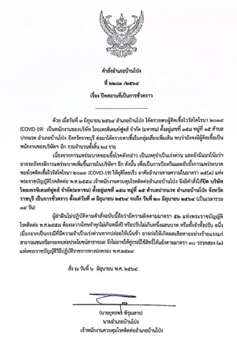 จึงมีคำสั่งปิด บริษัท ไทยเพรชิเดนท์ฟูดส์ จำกัด (มหาชน) ตั้งอยู่เลขที่ 158 หมู่ 15 ต.ปากแรต อ.บ้านโป่ง จ.ราชบุรี เป็นการชั่วคราว ตั้งแต่วันที่ 7 มิถุนายน 2564 จนถึงวันที่ 20 มิถุนายน 2564ทั้งนี้เมื่อครบกำหนดระยะเวลาปิดให้เจ้าพนักงานควบคุม โ ร ค ติดต่อในพื้นที่ประเมิน หากมีเหตุจำเป็นเร่งด่วนต้องขยายระยะเวลาปิดให้เสนอมาที่คณะกรรมการ โ ร ค ติดต่อจังหวัดราชบุรี ผู้ฝ่าฝืนไม่ปฏิบัติตามคำสั่งฉบับนี้ถือว่ามีความผิดตามมาตรา 52 แห่งพระราชบัญญัติโรคติดต่อ พ.ศ.2558 ต้องระวางโทษ จ ำ คุ ก ไม่เกินหนึ่งปี หรือปรับไม่เกินหนึ่งแสนบาท หรือทั้งจำทั้งปรับ