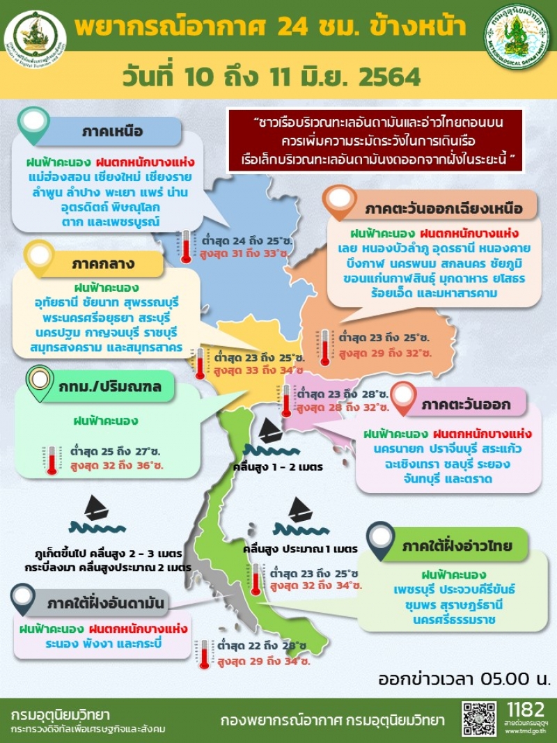 วันที่ 10 มิ.ย.64 กรมอุตุนิยมวิทยา รายงานลักษณะอากาศทั่วไป พยากรณ์อากาศ 24 ชั่วโมงข้างหน้า ร่องมรสุมพาดผ่านภาคเหนือและภาคตะวันออกเฉียงเหนือตอนบน เข้าสู่หย่อมความกดอากาศต่ำบริเวณประเทศเวียดนาม และอ่าวตังเกี๋ย ประกอบกับมรสุมตะวันตกเฉียงใต้กำลังแรงพัดปกคลุมทะเลอันดามัน ประเทศไทย และอ่าวไทย