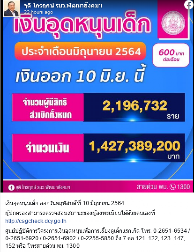 นาย จุติ ไกรฤกษ์ รัฐมนตรีว่าการกระทรวงพัฒนาสังคมและความมั่นคงของมนุษย์ โพสต์ภาพและข้อความผ่านเพจเฟซบุ๊ค จุติ ไกรฤกษ์ รมว.พัฒนาสังคมฯ ว่า เงินอุดหนุน เ ด็ ก ออกวันพฤหัสบดีที่ 10 มิถุนายน 2564 จำนวน 600 บาทต่อเดือน จำนวนผู้มีสิทธิส่งเบิกทั้งหมด 2,196,732 ราย จำนวนเงิน 1,427,389,200 บาท
