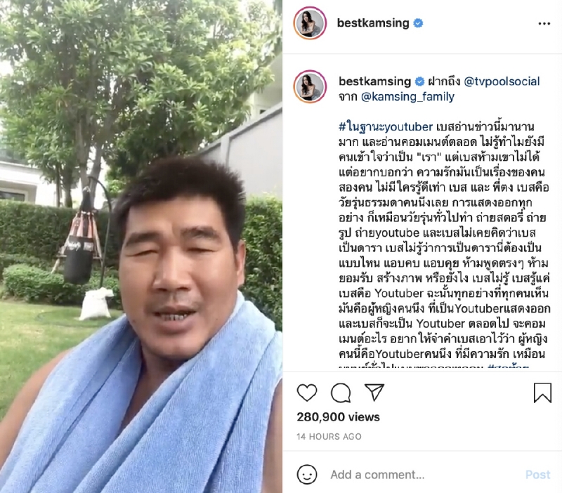 เขาแสดงความรักกันด้วยความบริสุทธิ์ใจ คนหลายล้านคนในประเทศเขามองออก แต่คุณกลับมาหาว่าเขาเป็นรักลวงโลกแสดง คุณคงชินกับการกินแบบ แ อ บ แ ซ่ บ ถ้ามา แ อ บ แ ซ่ บ กับลูกผม ผม เ ต ะ ก้าน ค อ ป า ก แ ต ก ไปแล้ว ผมสอนลูกผมให้ตรงไปตรงมา ไม่หลอกลวงประชาชน แต่ผมในฐานะคนเป็นพ่อก็ขออกมาปกป้องลูกของผมและตงตง คุณมาว่าลูกผมหิวแสง แต่ช่องคุณนี่แหละ หิวเรตติ้ง มาโจม ตี ลูกผมเพื่อเรียกเรตติ้งมันน่า ต่ อ ย ป า ก แ ต ก จริงๆ