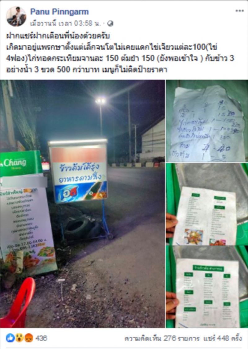 โดยผู้ใช้เฟซบุ๊กท่านนี้ระบุว่า ฝากแชร์ฝากเตือนพี่น้องด้วยครับเกิดมาอยู่แพรกษาตั้งแต่เล็กจนโตไม่เคยกินไข่เจียวจานละ100 ไข่4ฟอง ไก่ทอดกระเทียมจานละ 150 ต้มยำ 150 ยังพอเข้าใจ กับข้าว 3 อย่างน้ำ 3 ขวด 500 กว่าบาท เมนูก็ไม่ติดป้ายราคา