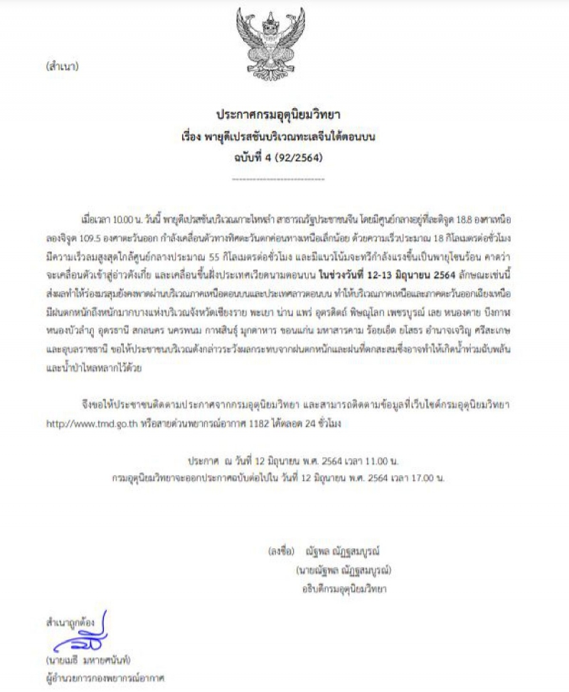ประกาศกรมอุตุนิยมวิทยา "พายุดีเปรสชันบริเวณทะเลจีนใต้ตอนบน" ฉบับที่ 4 ลงวันที่ 12 มิถุนายน 2564