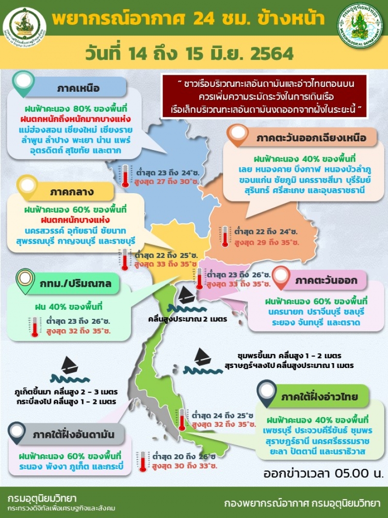 วันที่ 14 มิ.ย.2564 กรมอุตุนิยมวิทยา พยากรณ์อากาศ 24 ชั่วโมงข้างหน้า ร่องมรสุมพาดผ่านตอนบนของภาคเหนือ เข้าสู่หย่อมความกดอากาศต่ำกำลังแรงบริเวณประเทศลาวตอนบน ประกอบกับมรสุมตะวันตกเฉียงใต้กำลังแรงยังคงพัดปกคลุมทะเลอันดามัน ประเทศไทย และอ่าวไทย ลักษณะเช่นนี้ทำให้บริเวณภาคเหนือ และภาคกลางมีฝนตกหนักบางแห่ง ขอให้ประชาชนบริเวณดังกล่าวระวังอันตรายจากฝนตกหนักถึงหนักมาก และฝนที่ตกสะสมในระยะนี้ไว้ด้วย
