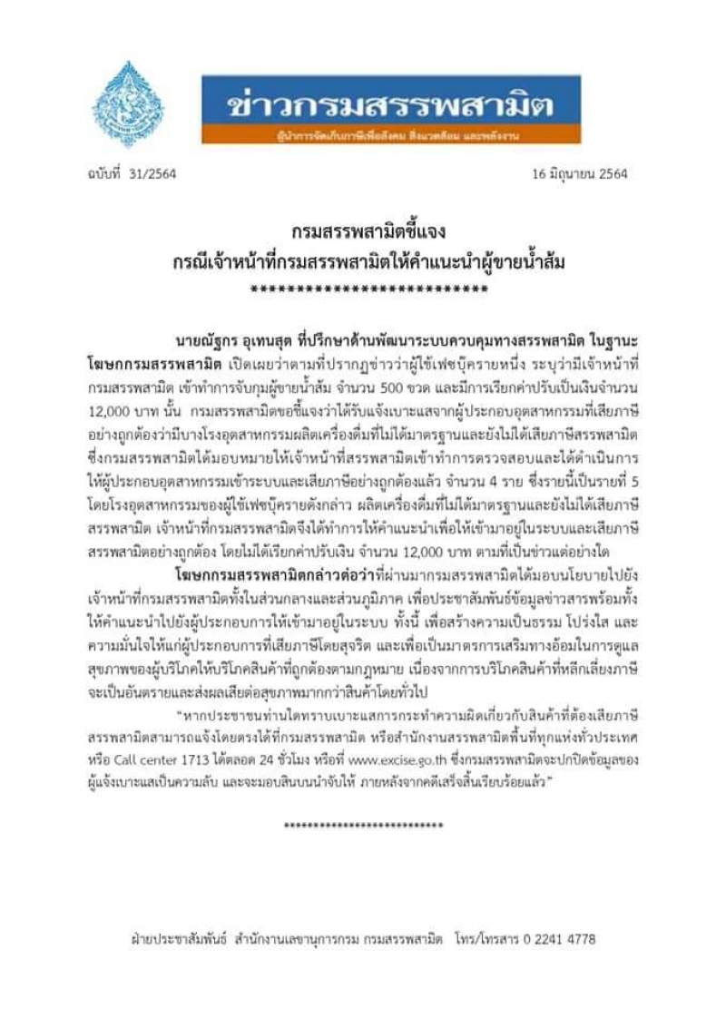 นายณัฐกร อุเทนสุต ที่ปรึกษาด้านพัฒนาระบบควบคุมทางสรรพสามิต ในฐานะโฆษกกรมสรรพสามิต เปิดเผยว่าตามที่ปรากฏข่าวว่าผู้ใช้เฟซบุ๊ครายหนึ่ง ระบุว่ามีเจ้าหน้าที่กรมสรรพสามิต เข้าทำการจับกุมผู้ขายน้ำส้ม จำนวน 500 ขวด และมีการเรียกค่าปรับเป็นเงินจำนวน 12,000 บาท นั้น กรมสรรพสามิตขอชี้แจงว่าได้รับแจ้งเบาะแสจากผู้ประกอบอุตสาหกรรมที่เสียภาษีอย่างถูกต้องว่ามีบางโรงอุตสาหกรรมผลิตเครื่องดื่มที่ไม่ได้มาตรฐานและยังไม่ได้เสียภาษีสรรพสามิต