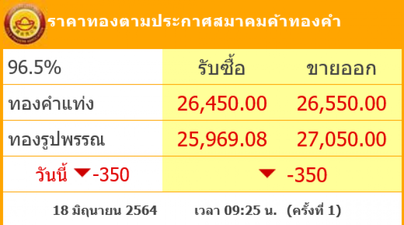 ราคาทองคำประจำวันนี้ (18 มิ.ย.) ปรับลง 350 บาท เมื่อเทียบกับราคาปิดวานนี้ โดยราคาทองรูปพรรณขยับมาอยู่ที่บาทละ 27,050 บาท อ้างอิงข้อมูลล่าสุดจากสมาคมค้าทองคำ ที่เผยแพร่ผ่านทางเว็บไซต์ เมื่อเวลา 9:25 น. ที่ผ่านมา