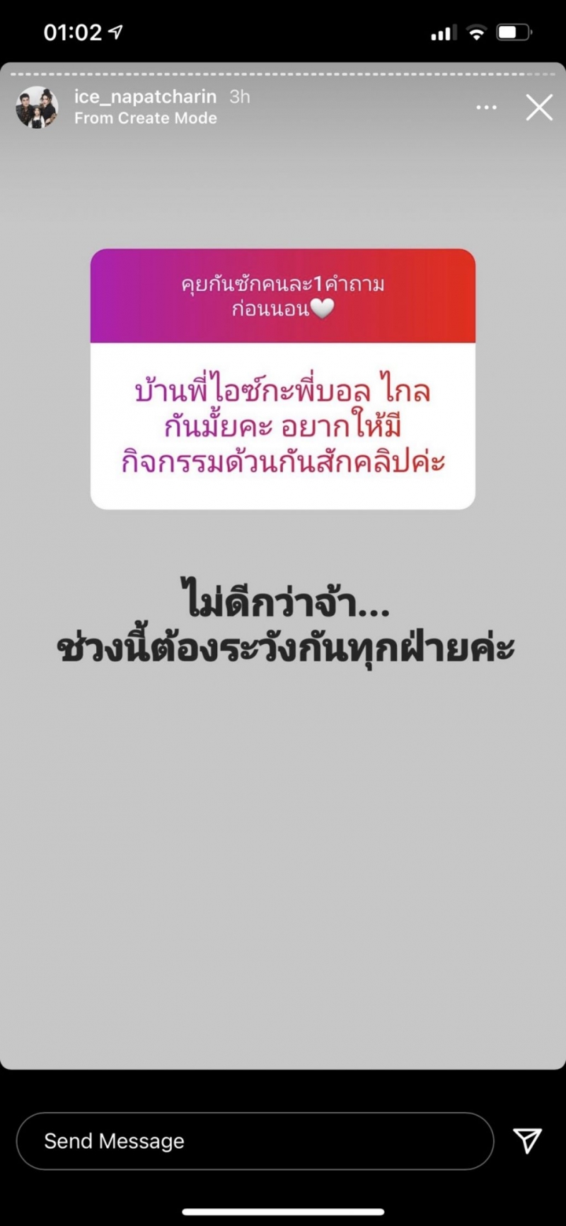 ล่าสุดทางด้าน ไอซ์ ณพัชรินทร์ ก็ได้เปิดให้ชาวถามคำถามได้คนละ 1 คำถามในอินสตาแกรม ซึ่งงานนี้ก็ได้มีชาวเน็ตรายหนึ่งเข้ามาคอมเมนต์เอาไว้ว่า บ้านไอซ์กับพี่บอลไกลกันไหมคะ อยากให้มีกิจกรรมด้วยกันสักคลิปค่ะ ซึ่งทางด้าน ไอซ์ ณพัชรินทร์ ก็ได้เข้ามาตอบกลับว่า ไม่ดีกว่าจ้า.... ช่วงนี้ต้องระวังกันทุกฝ่ายค่ะ