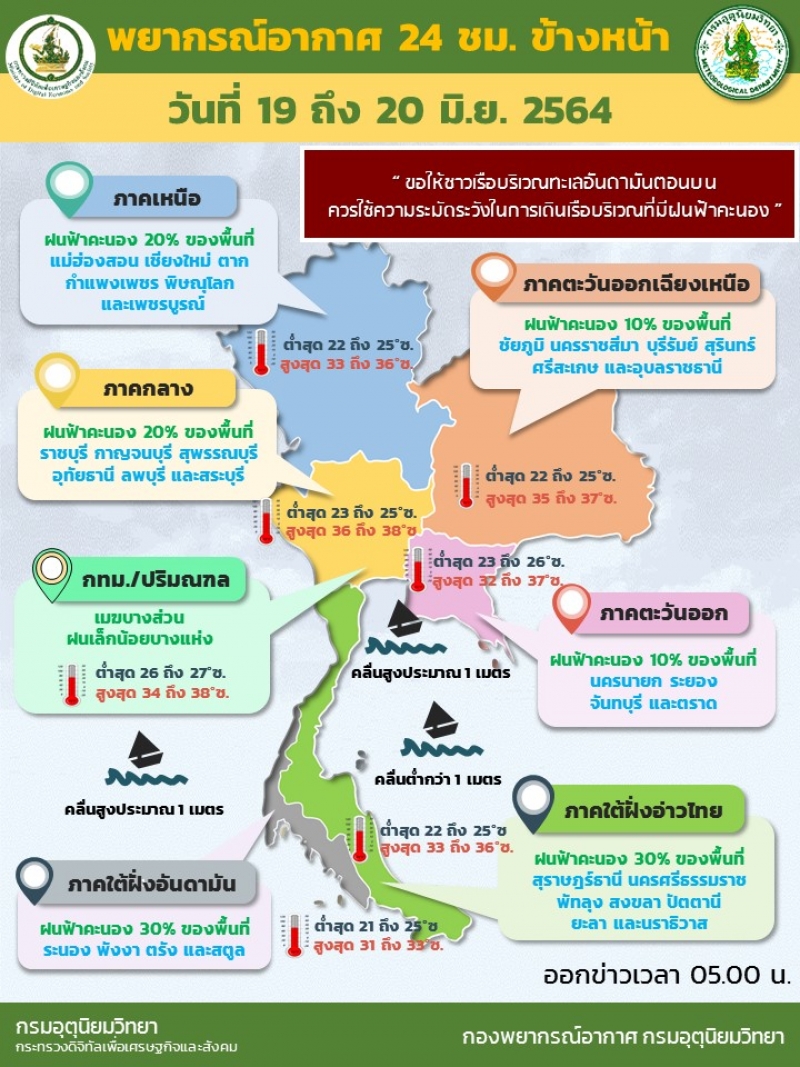 ส่วนคลื่นลมบริเวณทะเลอันดามันและอ่าวไทยตอนบนมีกำลังอ่อน ขอให้ชาวเรือบริเวณทะเลอันดามันตอนบนควรใช้ความระมัดระวังในการเดินเรือบริเวณที่มีฝนฟ้าคะนอง