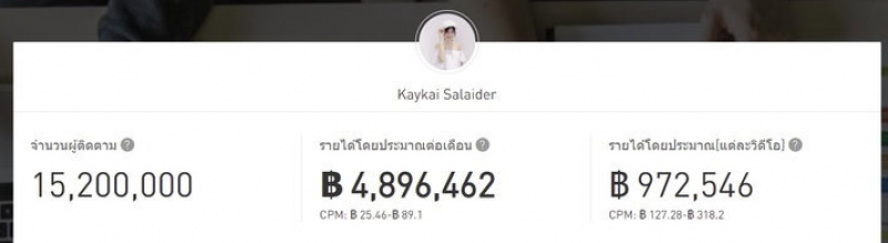 ก่อนอื่นต้องบอกก่อนว่า รายได้ต่อคลิปของเธอนั้นก็ได้ถึง 9 แสนกว่าแล้วทำให้เดือนๆหนึ่งมีรายได้อยู่ที่ประมาณ 4,896,462 บาท