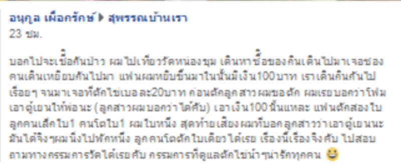 บอกไปจะเชื่อกันป่าว ผมไปเที่ยววัดหน่องขุม เดินหาซื้อของกินเดินไปมาเจอซองคนเดินเหยียบกันไปมา แฟนผมหยิบขึ้นมาในนั้นมีเงิน100บาท เราเดินกินกันไปเรื่อยๆ จนมาเจอที่ตักไข่เบอละ20บาท ก่อนตักบุตรสาวผมขอตัก ผมเลยบอกว่าโฟมเอาตู้เย็นให้พ่อนะ บุตรสาวผมบอกว่าได้คับ