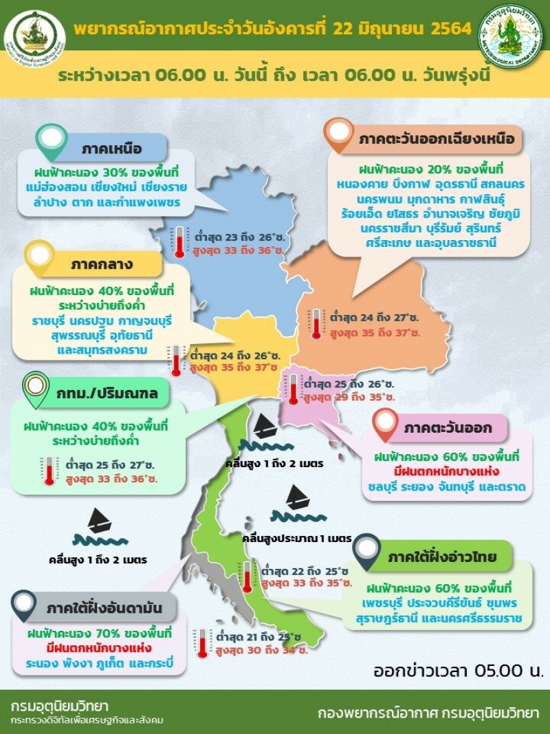 เมื่อวันที่ 22 มิถุนายน กรมอุตุนิยมวิทยา พยากรณ์อากาศ 24 ชั่วโมงข้างหน้า มรสุมตะวันตกเฉียงใต้กำลังปานกลางพัดปกคลุมทะเลอันดามัน ประเทศไทย และอ่าวไทย ลักษณะเช่นนี้ทำให้ด้านรับมรสุมของภาคกลาง ภาคตะวันออก และภาคใต้ ยังคงมีฝนฟ้าคะนองเกิดขึ้น กับมีฝนตกหนักบางแห่งบริเวณภาคตะวันออกและภาคใต้ฝั่งตะวันตก
