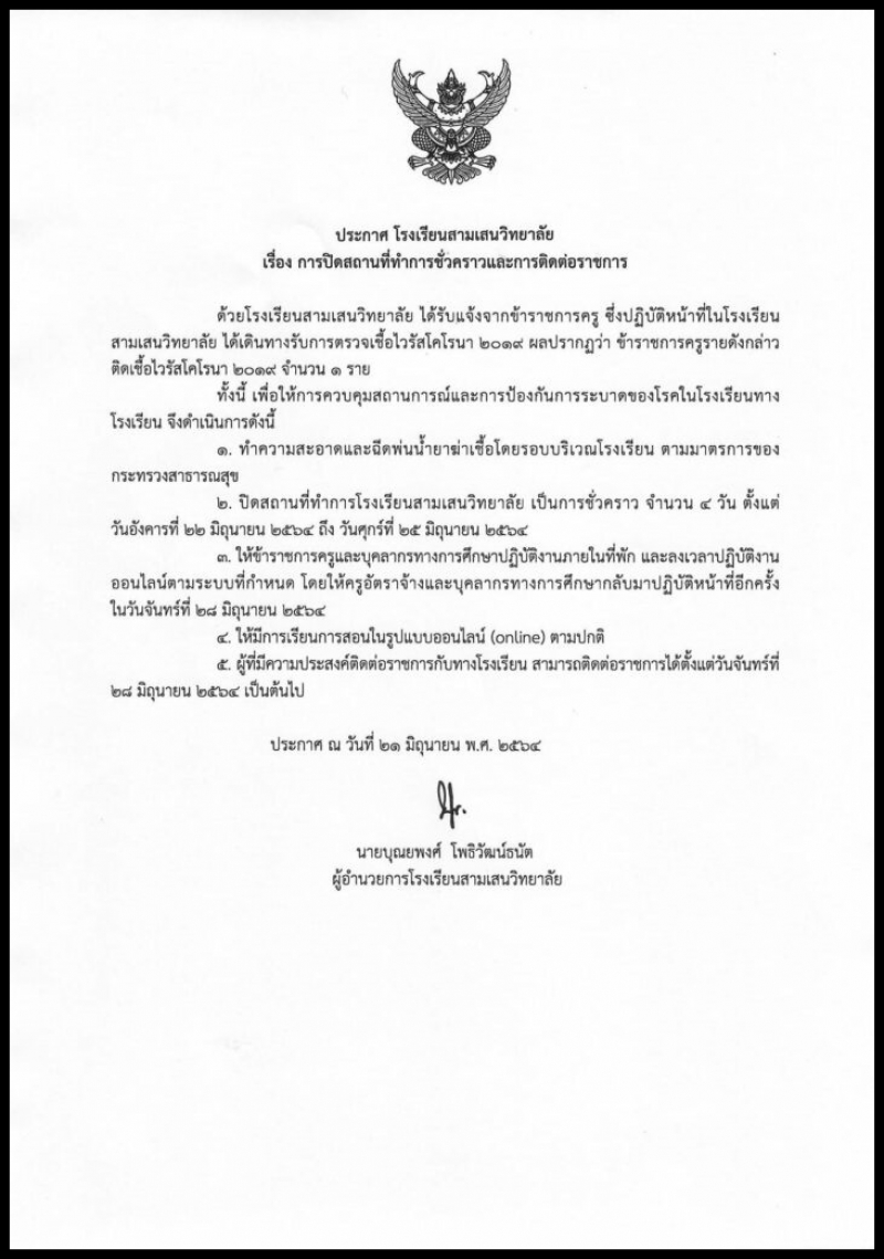 21มิ.ย64 ทางด้านโรงเรียนสามเสนวิทยาลัย ได้ออกมาประกาศปิดโรงเรียน 4 วัน เนื่องจากพบครูภายในโรงเรียน ติ ด โ ค วิ ด 1 รายโดยให้ปิดตั้งแต่วันที่ 22-25 มิ.ย. 2564