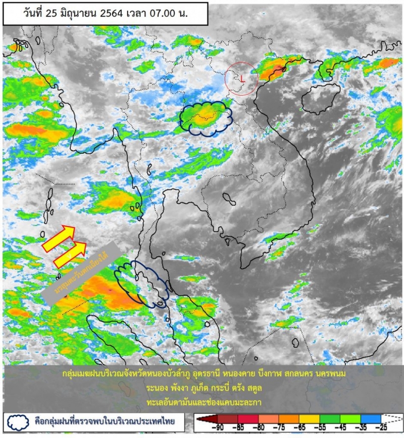 25 มิ.ย. 64 กรมอุตุนิยมวิทยา พยากรณ์อากาศ 24 ชั่วโมงข้างหน้า ตั้งแต่เวลา 06.00 น.วันนี้ (25 มิ.ย.) เวลา 06.00 น.วันพรุ่งนี้ ( 26 มิ.ย.)มรสุมตะวันตกเฉียงใต้พัดปกคลุมทะเลอันดามัน ประเทศไทย และอ่าวไทย ประกอบกับยังคงมีหย่อมความกดอากาศต่ำปกคลุมประเทศลาวและเวียดนามตอนบน ลักษณะเช่นนี้ทำให้บริเวณประเทศไทยตอนบนมีการกระจายของฝนน้อย เว้นแต่บริเวณรับลมมรสุมตะวันตกเฉียงใต้ และภาคตะวันออกเฉียงเหนือ ส่วนคลื่นลมบริเวณทะเลอันดามันและอ่าวไทยตอนบนมีคลื่นสูง 1-2 เมตร บริเวณที่มีฝนฟ้าคะนองคลื่นสูงประมาณ 2 เมตร